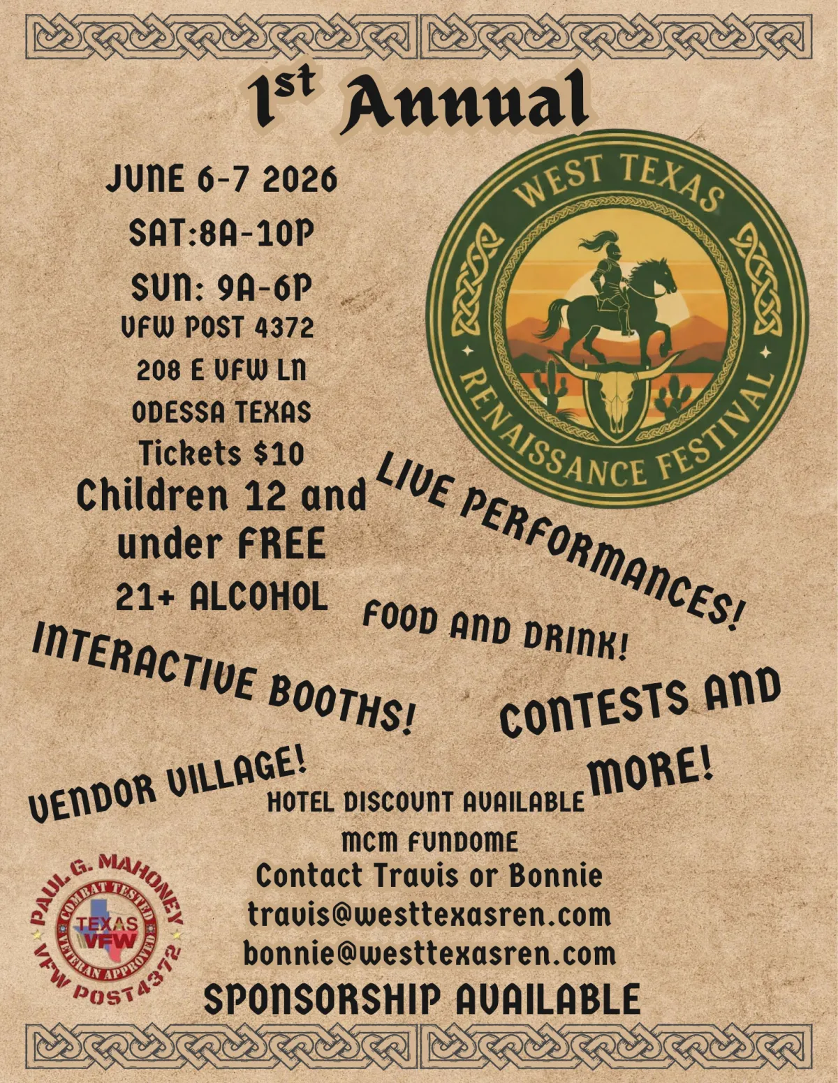 By checking this box, I consent to receive marketing and promotional messages including special offers, discounts, new product updates among others.from West Texas Renaissance Festival at the phone number provided. Frequency may vary. Message & data rates may apply. Text HELP for assistance, reply STOP to opt out.